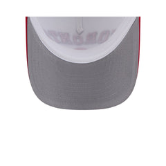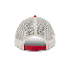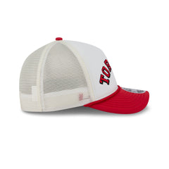 The Toronto Raptors Chrome Arch 9FORTY M-Crown A-Frame Trucker Hat features an embroidered Raptors logo at the foam front panels with a snapback closure at a mesh rear.