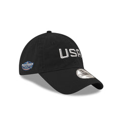 The USA 2025 4 Nations Face-Off 9TWENTY Adjustable Cap features an embroidered USA logo at the front panels with a 2025 4 Nations Face-Off patch at the right-wear side and an adjustable D-Ring closure at the rear.