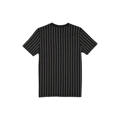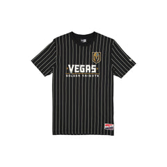 The Vegas Golden Knights Throwback Pinstripe Wordmark T-Shirt features a twill applique Golden Knights wordmark and logo at the front with a New Era jock tag at the left hip.