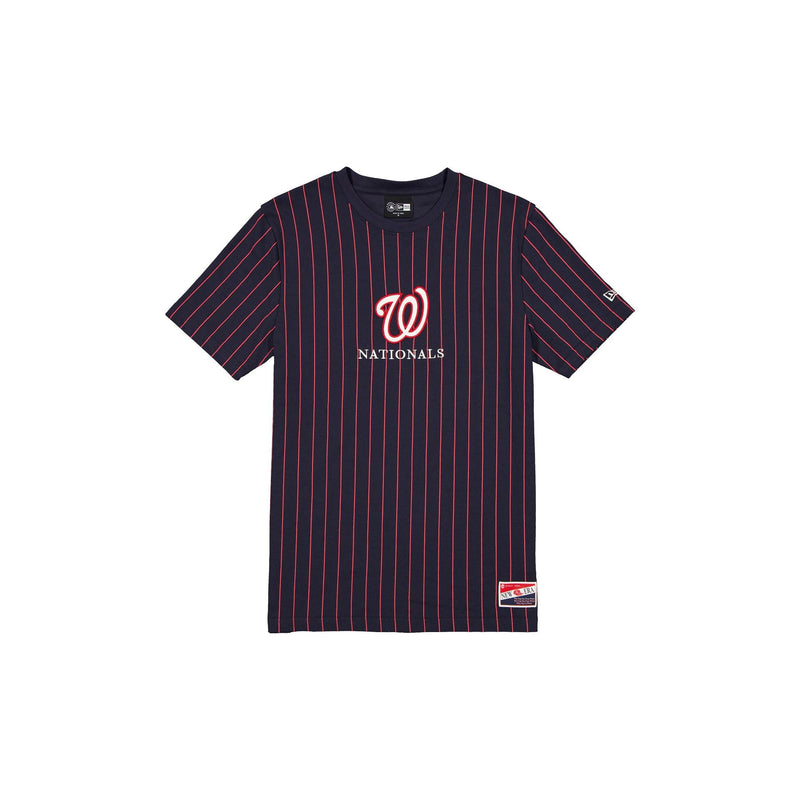 The Washington Nationals Throwback Pinstripe T-Shirt features an embroidered Nationals logo and wordmark at the front with a New Era jock tag at the left hip.