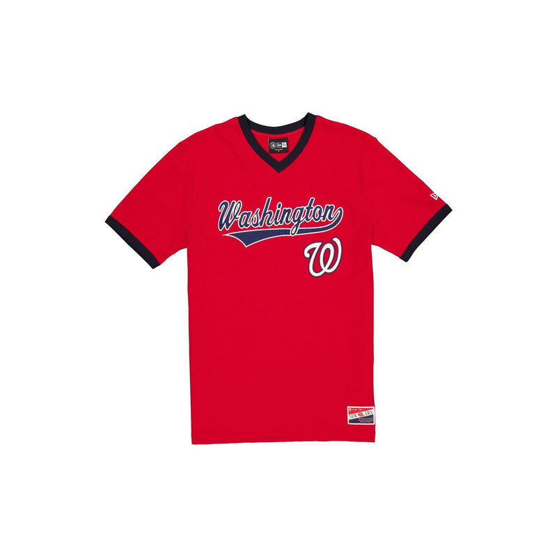 The Washington Nationals Throwback Team T-Shirt features a screen-printed Nationals wordmark and embroidered team logo at the front with a New Era jock tag at the left hip. This t-shirt has a v-neckline.