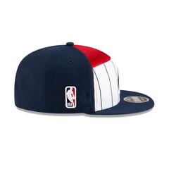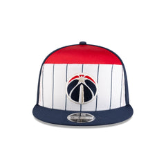 The Washington Wizards 2025 Tip-Off Split Panel 9FIFTY Snapback features an embroidered Wizards logo at the front panels against a pinstripe jersey fabrication with the NBA Logoman at the right-wear side. Additional details include an adjustable snapback closure at the rear and a gray undervisor.