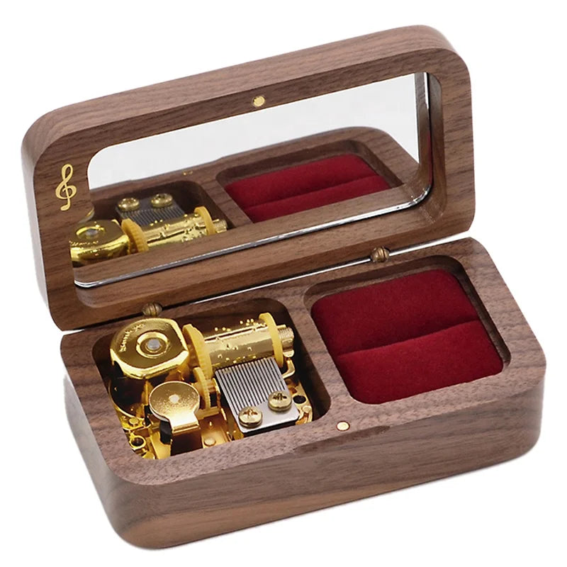 Celebrate meaningful moments with this hand-crafted wooden music box, designed as a timeless keepsake for weddings, proposals, and special occasions. The elegant rectangular shape and smooth wooden finish create a warm, natural charm. Powered by a traditional hand-crank movement, it plays a gentle melody while serving as a beautiful jewelry or ring holder. Available in maple, walnut, or rosewood finishes, this music box makes an unforgettable personalized gift for engagements, anniversaries, or birthdays.