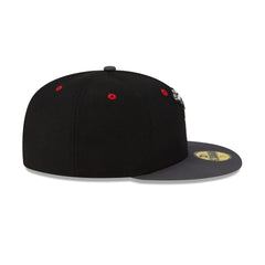 The Wisconsin Timber Rattlers Halloween Red 59FIFTY Fitted Cap features an embroidered Timber Rattlers themed logo at the front panels with a matching MiLB Batterman logo at the rear, a gray visor, and a red undervisor.